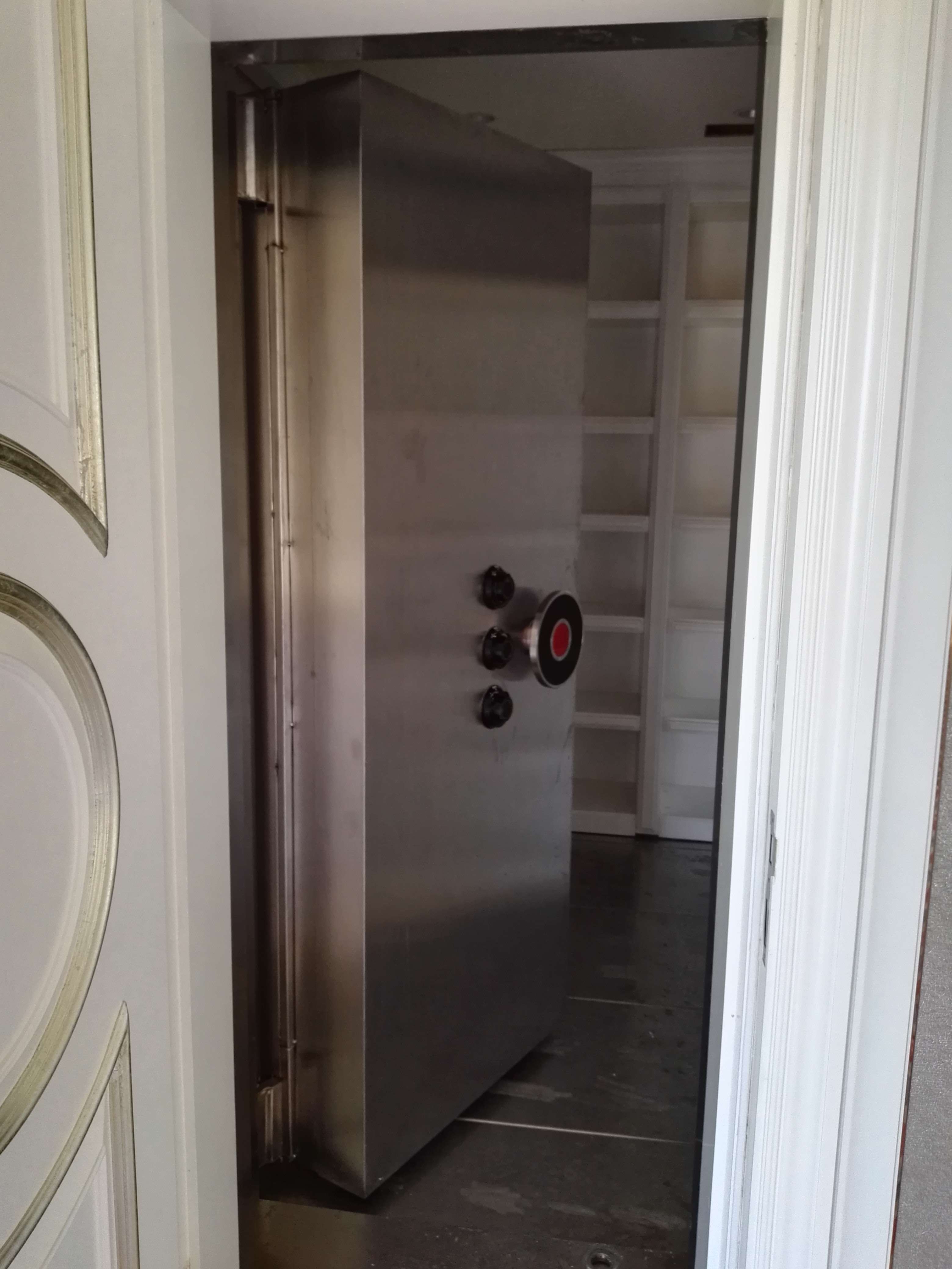 平開式密室門(金庫(kù)門外掛裝修柜一體式)金庫(kù)門體防護(hù)強(qiáng)度高,具有防盜、防火、防彈、防火焰切開、防TNT防爆等功能;